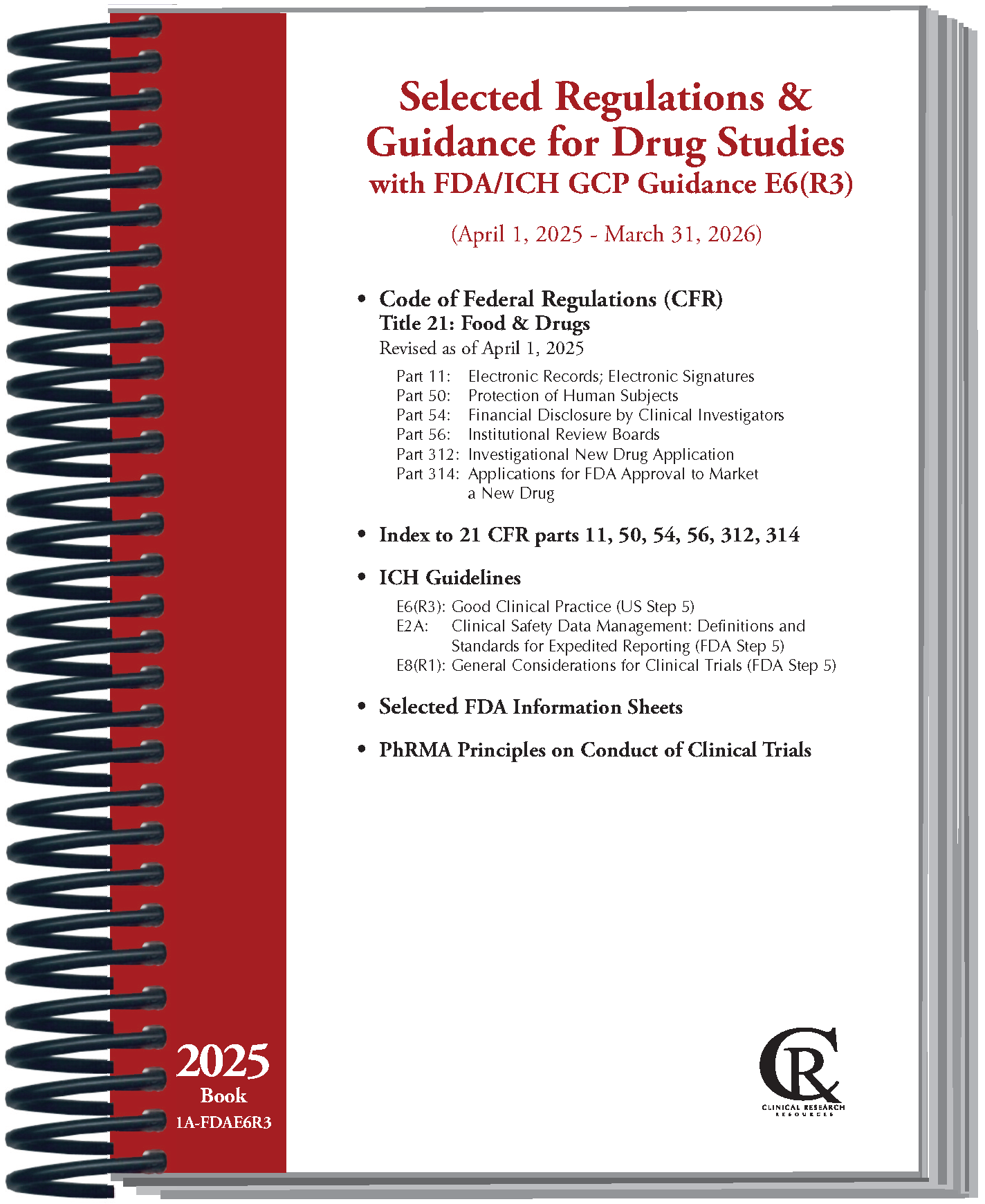 This spiral-bound, 5" x 7.5" book is a compilation of FDA regulations and guidance documents that govern the conduct of clinical trials for drug research and submission of applications to FDA for marketing approval (NDAs). It includes all of 21 CFR Part 314 on NDAs and the ICH GCP Guideline E6(R3).